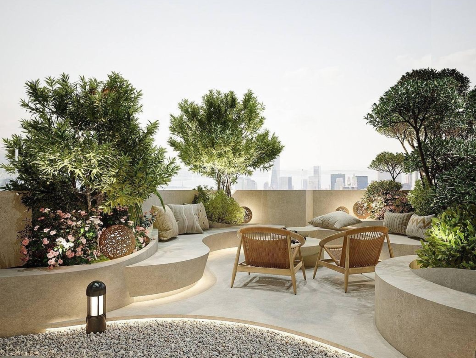 A contemporary rooftop garden designed as a serene outdoor lounge, featuring curved concrete seating, integrated warm LED strip lighting, and natural stone flooring. The space is surrounded by lush greenery, ornamental trees, and flowering plants arranged in sculpted planters. Two modern wooden lounge chairs sit at the center, creating an inviting social area. Decorative spherical garden lights and subtle bollard lighting enhance the ambiance. In the background, a soft, hazy city skyline adds depth and context. The lighting is warm and diffused, creating a calm, luxurious evening atmosphere with a focus on harmony between architecture and landscape design